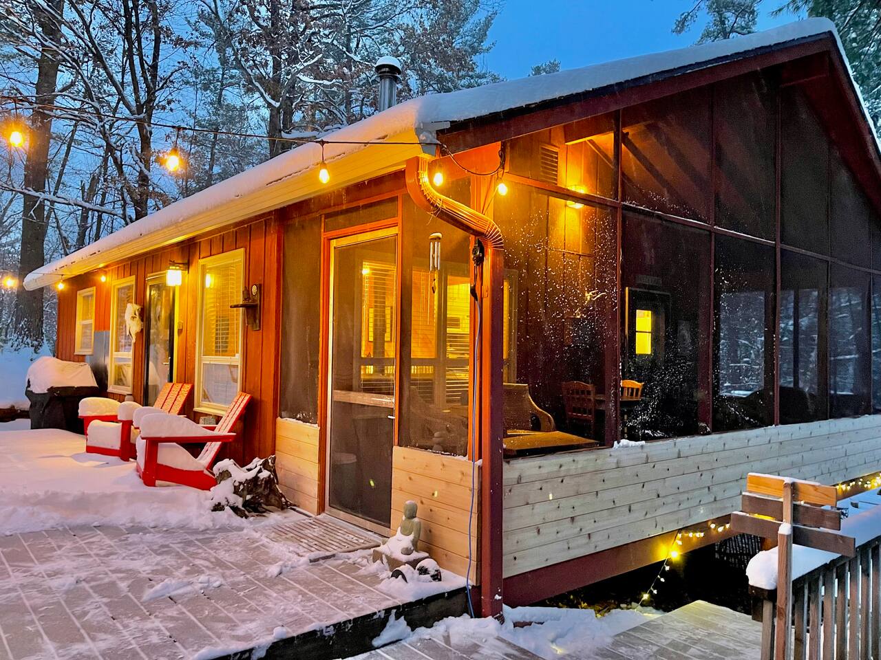 Extremely private wooded getaway nestled deep in the woods overlooking the Wood River, about an hour drive from the Twin Cities & 2.0 miles from the St Croix River. With modern touches, it's still very much a cabin. Relax on the wood deck on top of the ravine or in the large screen porch. Get cozy by the wood-stove, the new sauna, fire-pit or swim in the river. Enjoy total seclusion or visit many local restaurants & parks with great hiking, biking, canoeing, kayaking, birding, and skiing.